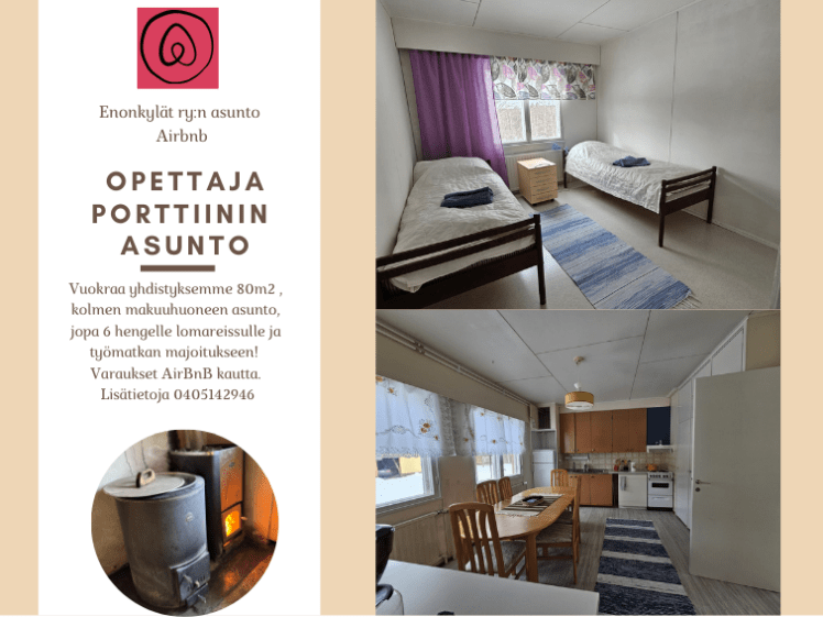 Enonkylätaloon kuuluu myös kolmen makuuhuoneen tilava asunto, joka on vuokrattavana esimerkiksi lomamatkan majoitukseksi tai työreissulle. Kalustettu asunto tarjoaa rauhallisia hetkiä maaseudun rauhassa lyhyeksi tai pidemmäksi aikaa.