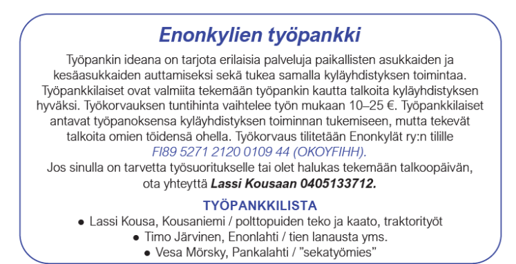 Voit tukea kyläyhdistyksen työtä myös vapaaehtoisella kannatusmaksulla: Enonkylät ry,