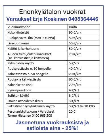 Enonkylät ry:n jäsenet saavat tilojen henkilökohtaiseen vuokraukseen -25% alennuksen vuokrahinnasta. Alennusta ei voi käyttää esimerkiksi yhteisöjen kokouksiin yms.