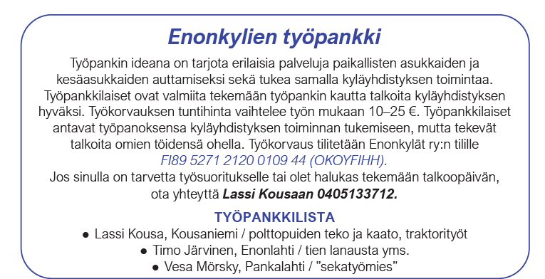 Enonkylät ry on kaikille avoin yhdistys ja otamme ilolla mukaan alueen toiminnasta kiinnostuneet ihmiset.